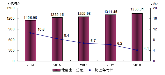 圖1:2014-2018年地區生產總值及增長速度(年均增長7.2%)