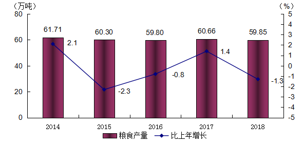 全年糧食產量59.85萬噸,下降1.3%;油料產量4.55萬噸,增長1.3%;蔬菜產量84.44萬噸,增長4.4%;水果產量37.65萬噸,增長6.3%。