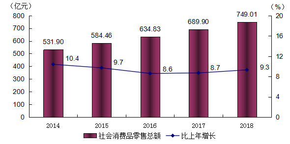 圖6:2014-2018年社會消費品零售總額及增速(年均增長9.3%)