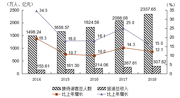 圖7:2014-2018年接待游客總人數和總收入及增長速度