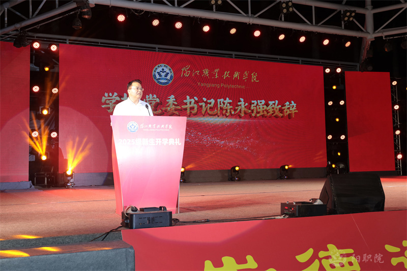 典禮在莊嚴的國歌中拉開了序幕。“歡迎你們加入陽江職院這個溫暖奮進的大家庭,愿這里成為你們逐夢青春的新起點。”陳永強在開學典禮上發表了熱情洋溢的講話,代表學校對新生們的到來表示熱烈的歡迎和誠摯的問候。他介紹了學校的辦學歷史和發展情況,勉勵同學們心懷家國,立鴻鵠之志;勤學善思,練就過硬本領;知行合一,勇于實踐創新;修身立德,錘煉高尚品格;熱愛學校,融入校園文化。“路漫漫其修遠兮,吾將上下而求索”,陳永強希望同學們珍惜韶華、不負時代、不負囑托,在陽江職院這個大學堂,以青春之我、奮斗之我,書寫屬于自己的精彩華章,成長為有理想、敢擔當、能吃苦、肯奮斗的新時代好青年。