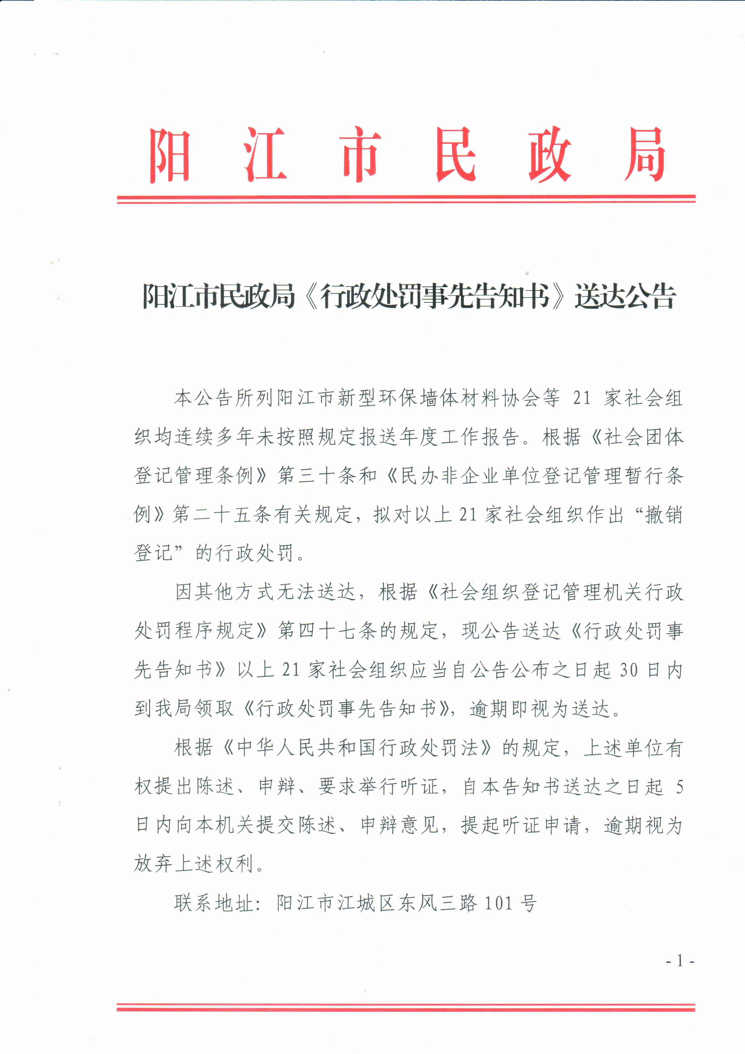 陽江市民政局《行政處罰事先告知書》送達公告