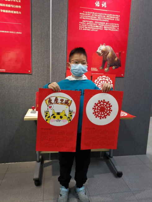 02給大家拜年啦 畫畫與剪紙 講解員生動的解說,沉浸式觀展,兒童對與虎有關的東西進行思考后開啟繪畫活動。孩子們自由大膽創作的作品,或顯稚趣、或具生動,或富奇思妙想。讓他們真切感受到了博物館給他們帶來的別樣樂趣。 最后,孩子們的作品蓋上了陽江市博物館的印章并將在春節期間在館內展出。 蓋章&合照 03相關信息 《虎虎生福--壬寅(虎年)新春生肖文物圖片聯展》由國家文物局為指導單位,中國文物報社、廣東省博物館(廣州魯迅紀念館)等50個文博單位為主辦,廣東省流動博物館和陽江市博物館承辦,為陽江市民帶來2022年第一個虎年精品文物圖片展覽。 讓大眾走進博物館,讓兒童愛上博物館,在博物館內尋找知識、探索知識、實踐知識,是博物館公眾服務教育的重要職責之一。而讓小朋友拿起畫筆,把自己的所見所聞用畫筆的形式加以藝術呈現,是博物館社會教育工作中最有趣的實踐活動。