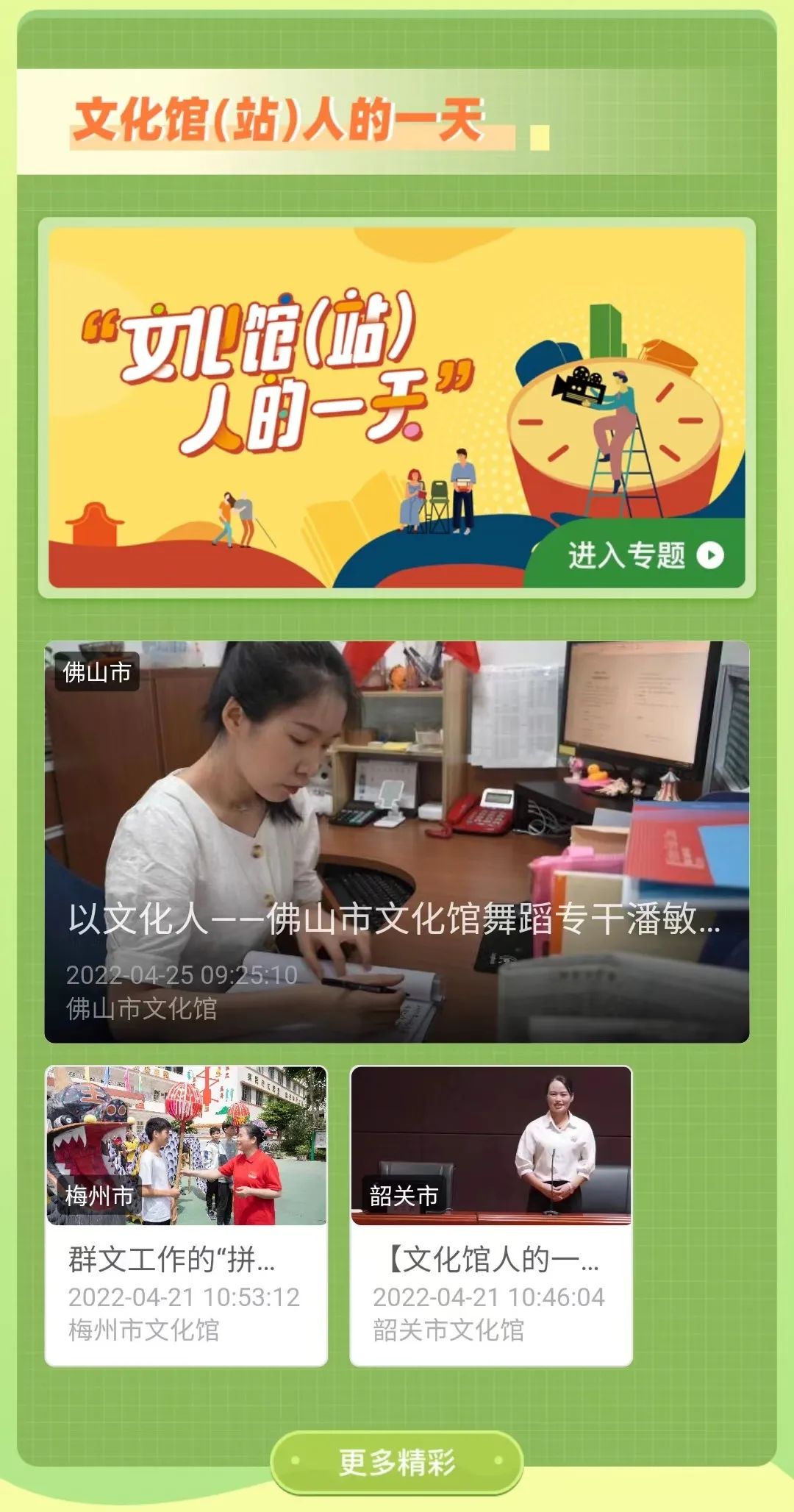 只需點擊進入廣東省2022年“文化館宣傳服務月”系列活動專題宣傳頁面,就能將全省各地文化館場館信息、惠民服務資訊和優質數字資源等“一網打盡”,正可謂:足不出戶,盡覽全省文化館風采;動動手指,即可報名參與活動。