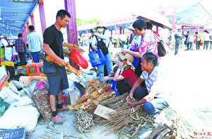 陳梅夫婦來自陽春市潭水鎮,作為古墟的“老朋友”,今年是他們過來擺攤的第八年。凌晨三點,他們就從家里出發,驅車滿載著百余種中草藥趕來趁墟。“我們提前半個月就開始上山挖各種中草藥,為這次墟期做準備。”陳梅告訴記者,今天賣得最好的是豬籠草,不到一個上午,已經快銷售完。在十幾分鐘的采訪時間里,陳梅夫婦就完成了5單生意,收入200余元。