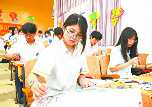 上圖:同學們在風箏上繪制圖案。 梁文棟 攝