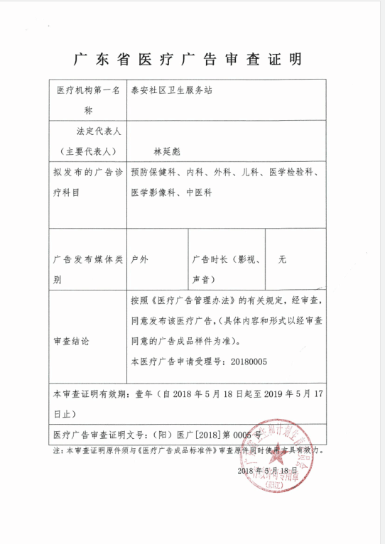 醫療廣告審查證明(泰安社區衛生服務站)