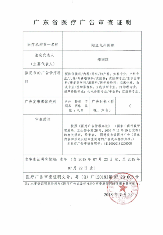 廣東省醫療廣告審查證明(陽江九州醫院)
