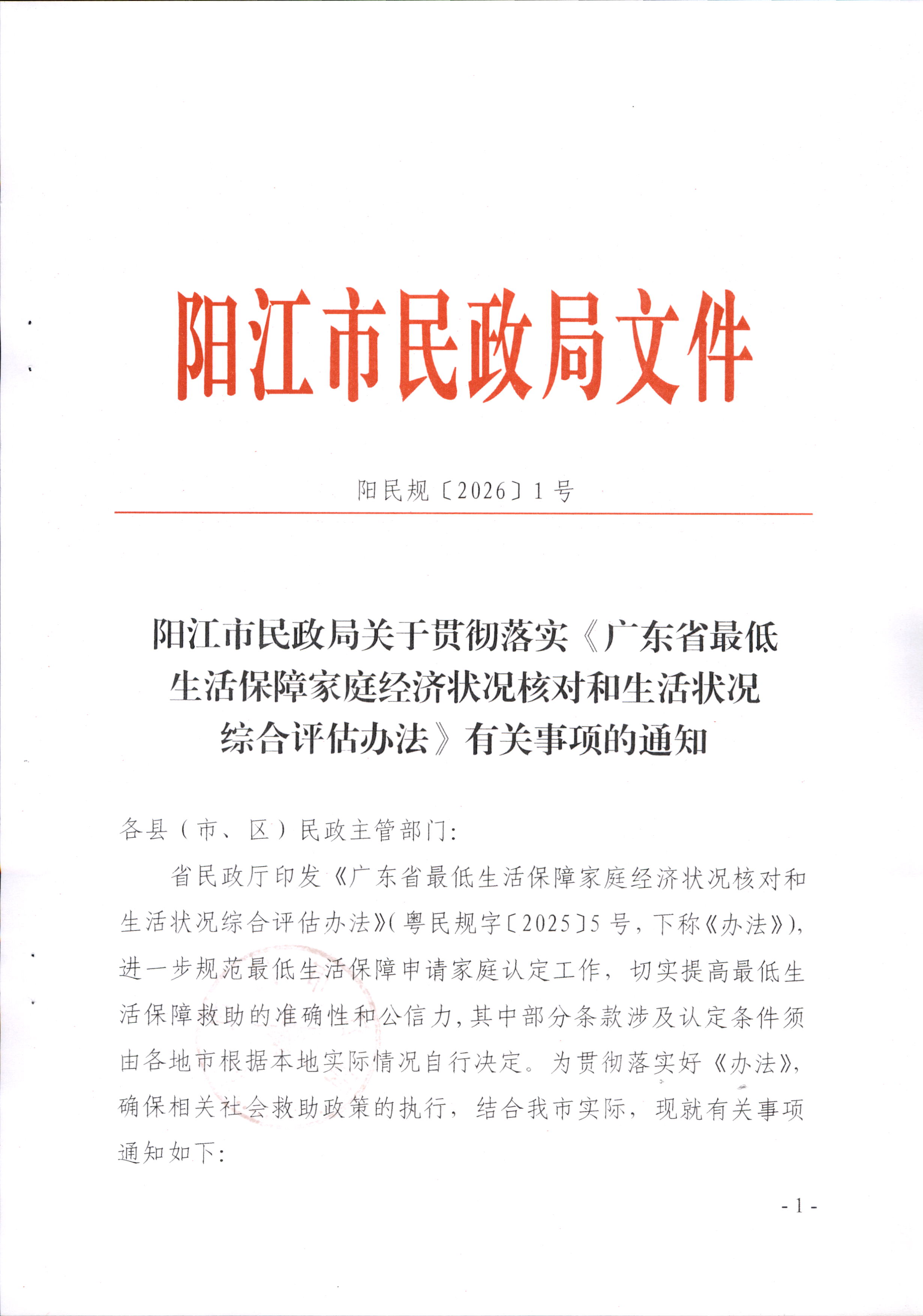 陽江市民政局關于貫徹落實《廣東省最低生活保障家庭經濟狀況核對和生活狀況綜合評估辦法》有關事項的通知