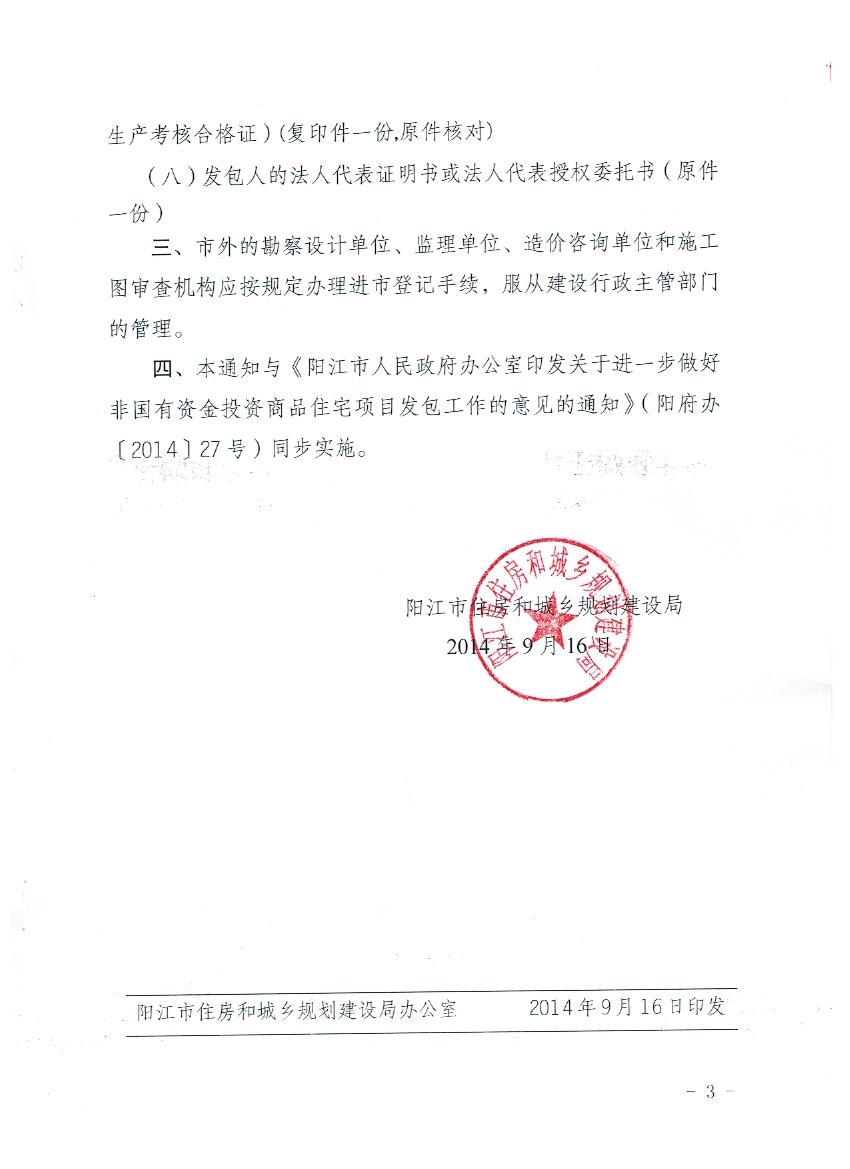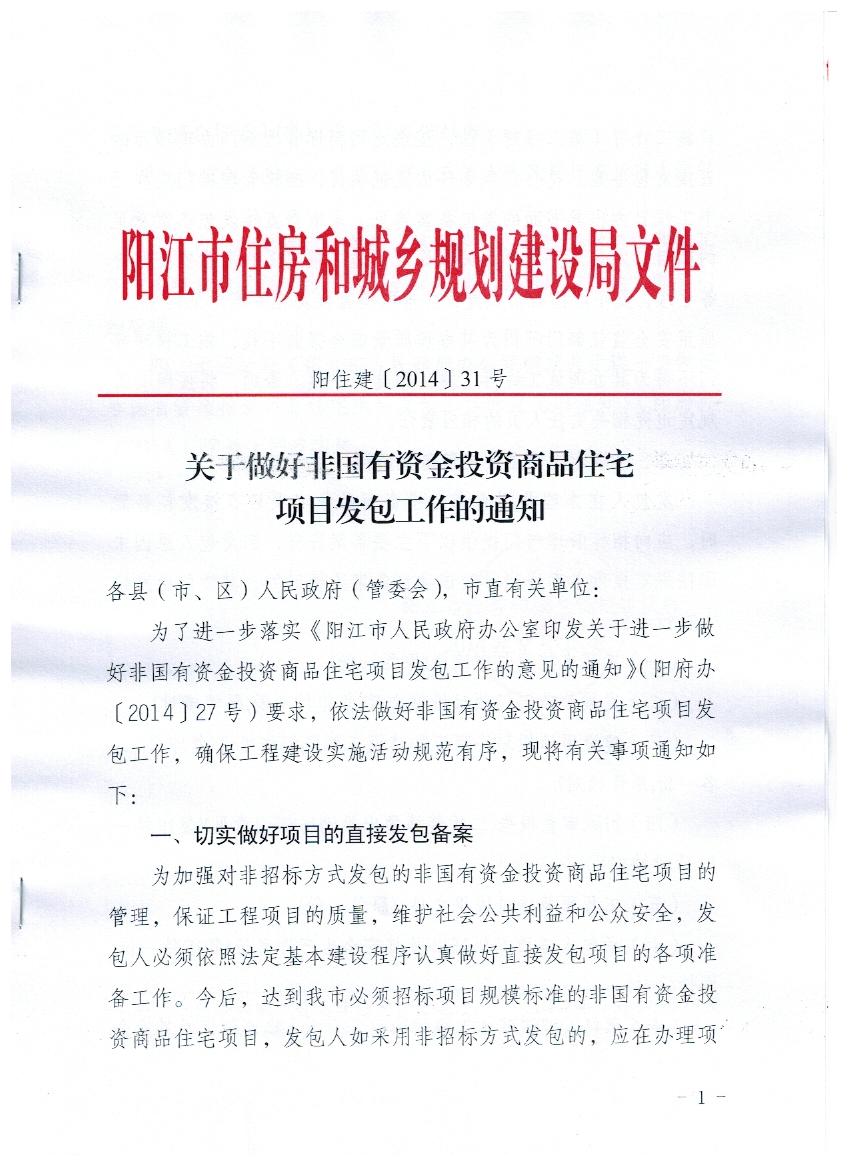 關(guān)于做好非國(guó)有資金投資商品住宅項(xiàng)目發(fā)包工作的通知(陽住建【2014】31號(hào))