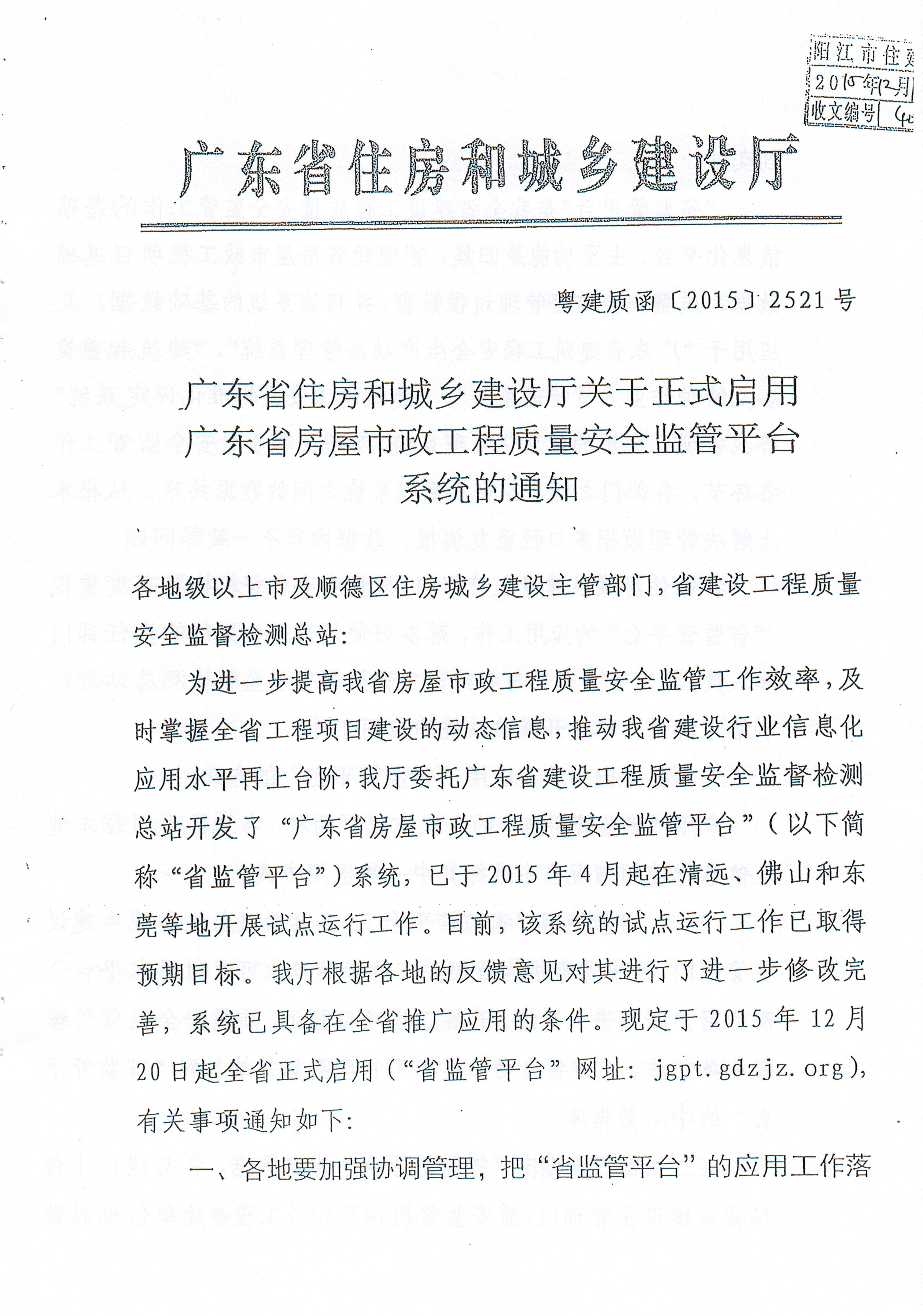 現將《廣東省住房和城鄉建設廳關于正式啟用廣東省房屋市政工程質量安全監管平臺系統的通知》(粵建質函〔
