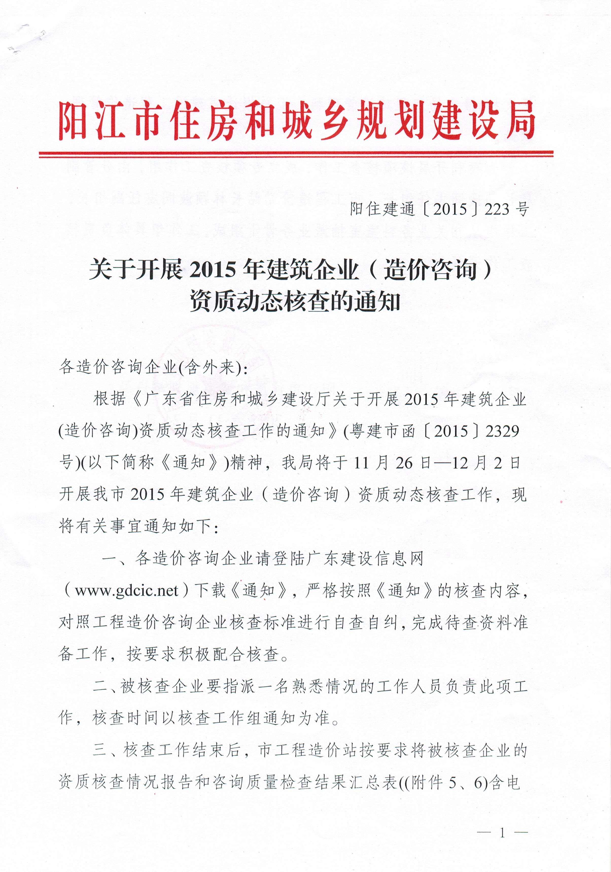 關于開展2015年建筑企業(造價咨詢)資質動態核查的通知
