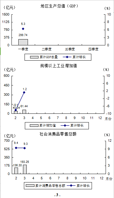 一季度,全市經(jīng)濟(jì)運(yùn)行總體平穩(wěn)。實現(xiàn)地區(qū)生產(chǎn)總值(GDP)299.74億元,同比增長5.3%。其中,第一、二、三產(chǎn)業(yè)分別增長3.5%、1.2%和10.0%。主要經(jīng)濟(jì)指標(biāo)情況如下: