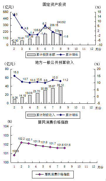 二、投資呈現(xiàn)回落態(tài)勢。1-8月,全市完成固定資產(chǎn)投資240.52億元,同比下降1.6%。其中,項(xiàng)目投資147.29億元,增長3.2%;房地產(chǎn)開發(fā)投資93.24億元,下降8.4%;工業(yè)投資91.07億元,增長21.9%;裝備制造業(yè)投資16.66億元,增長113.8%;基礎(chǔ)設(shè)施投資98.70億元,增長5.8%。