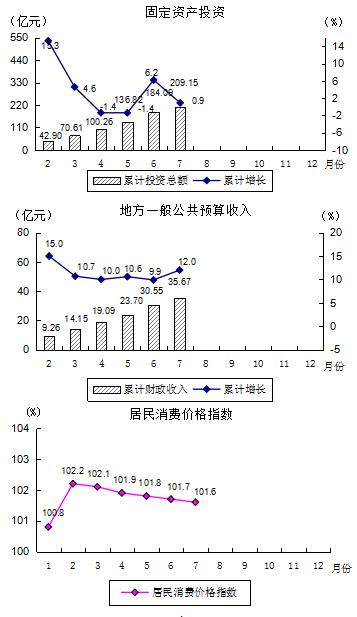 二、投資呈現(xiàn)低位增長(zhǎng)。1-7月,全市完成固定資產(chǎn)投資209.15億元,同比增長(zhǎng)0.9%。其中,項(xiàng)目投資131.35億元,增長(zhǎng)9.6%,拉動(dòng)全市投資增長(zhǎng)5.6個(gè)百分點(diǎn);房地產(chǎn)開發(fā)投資77.80億元,下降11.1%;工業(yè)投資82.88億元,增長(zhǎng)23.4%;裝備制造業(yè)投資15.93億元,增長(zhǎng)142.5%;基礎(chǔ)設(shè)施投資87.20億元,增長(zhǎng)8.7%。
